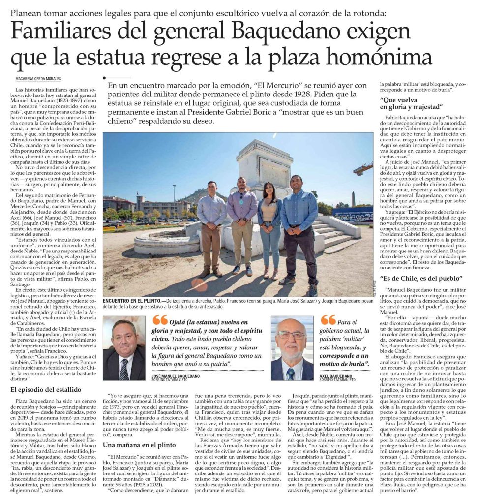 Los descendientes del General Manuel Baquedano nos reunimos en el plinto de la Plaza Baquedano para ofrecer una entrevista al diario El Mercurio, con el propósito de reflexionar sobre el valor histórico y patrimonial del monumento que honra su memoria.